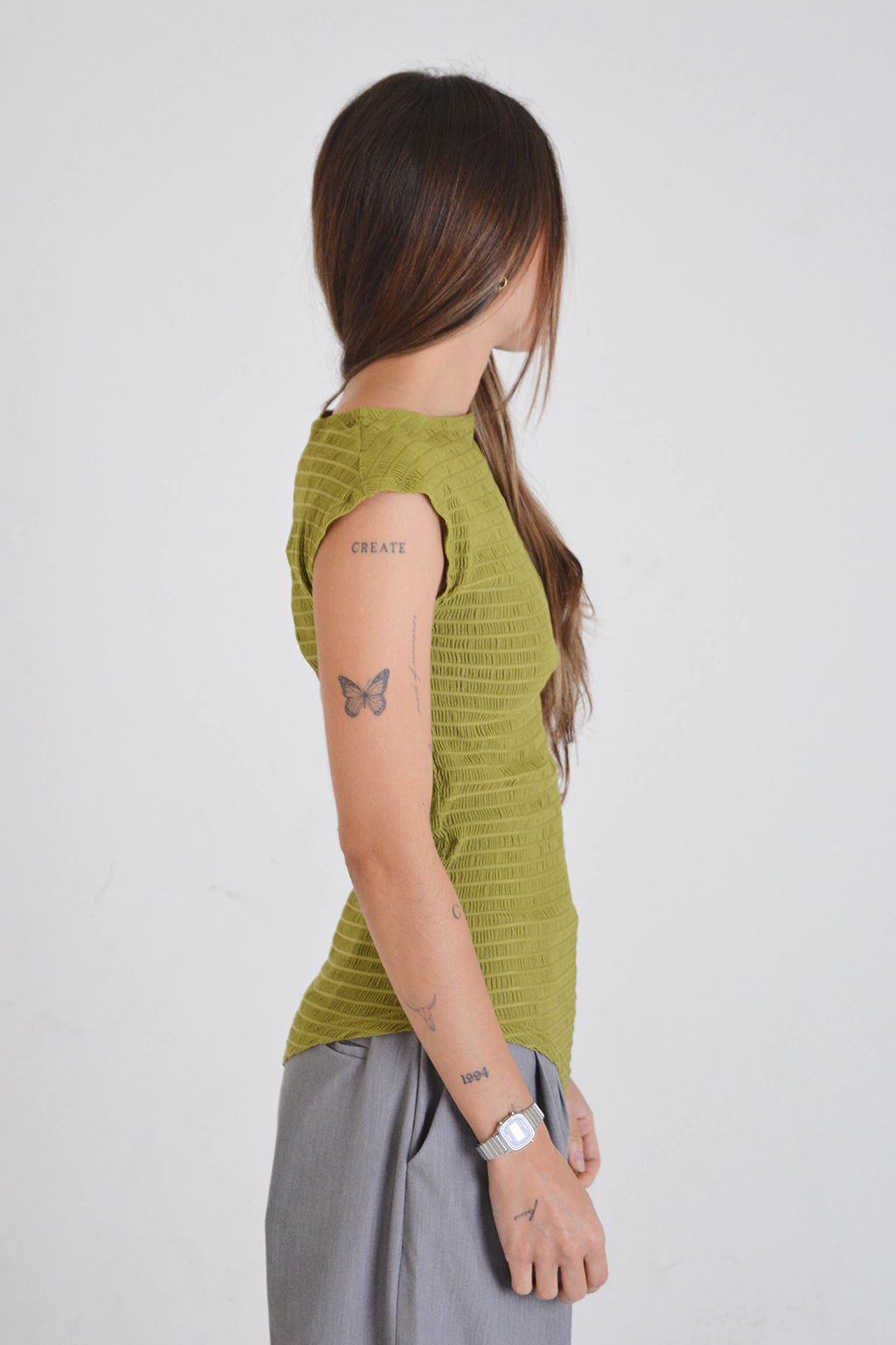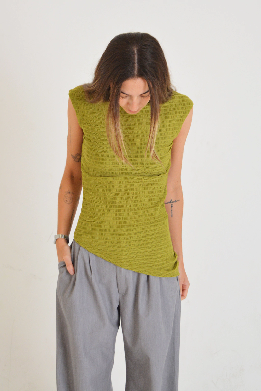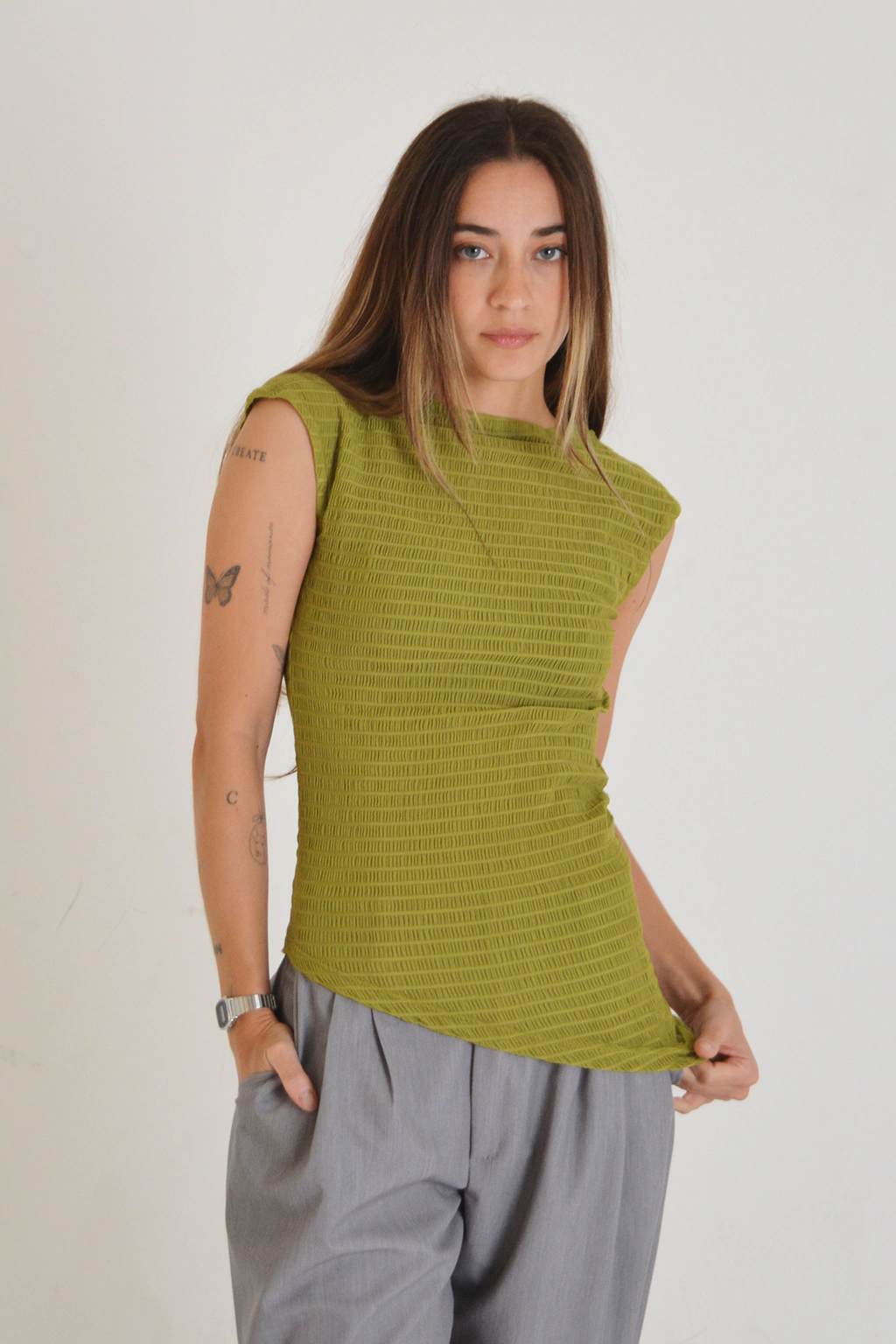 Top elastizado y ajustado al cuerpo, con un calce espectacular. Tiene escote tipo "bote", sin mangas y un corte diagonal en el frente inferior que realza la silueta. El elástico en cuello y sisas aporta mayor ajuste y comodidad. La silueta es ceñida y podés usarlo largo o fruncido hacia arriba según el outfit que elijas, y funciona muy bien dentro de pantalones o faldas.